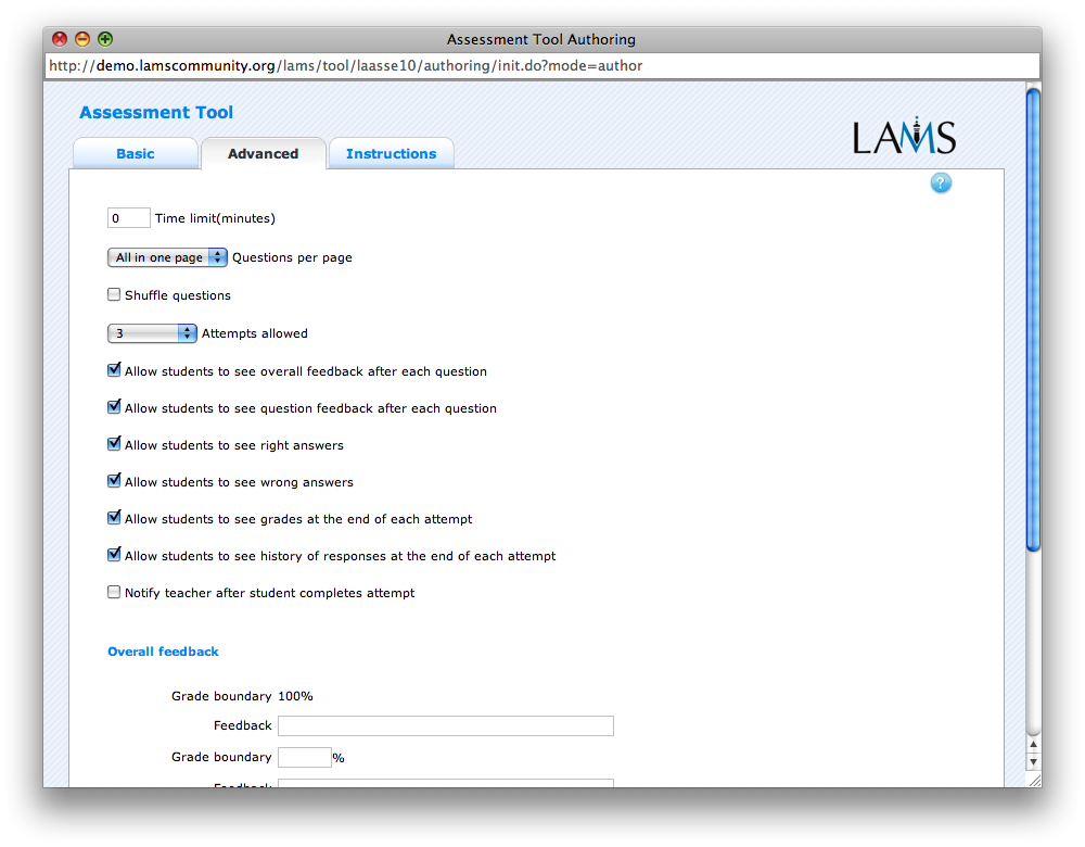 See that on the Advanced Tab in Author for the Assessment tool, you have a "Number of attempts" option. If you set it to say... three, then the students get a chance to re-try again upto three times. The attached sequence and pictures can show you how this works. If you want to prevent the user from continue with the sequence if he/she has not achieved the desired score, you can use a Gate activity. Thanks, Ernie Posted by Ernie Ghiglione |