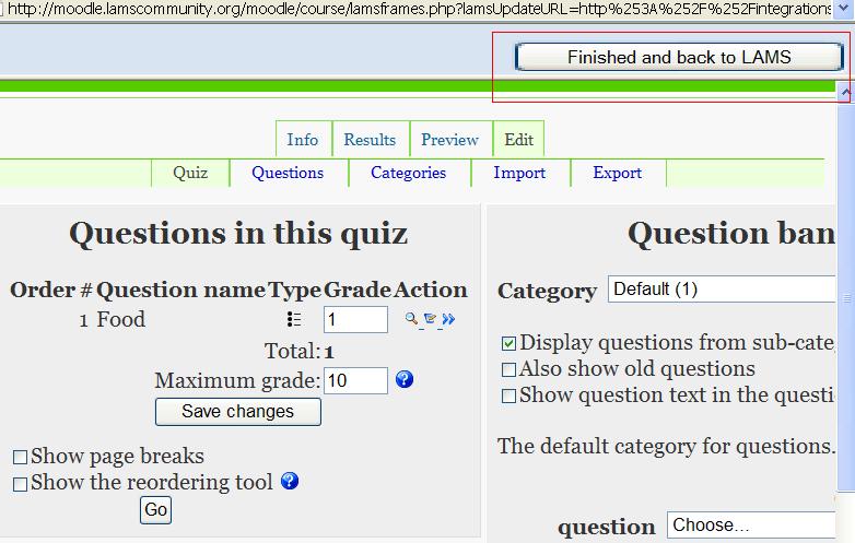 Marina, the Moodle Quiz tool adapter developer, sent me an email explaining me how to use the Moodle Quiz in LAMS... it wasn't a bug, it was just me having no idea how to use the Moodle Quiz At any rate, the results from the Moodle Quiz are indeed listed in the Moodle Gradebook. If you want to give it a go, have a look at http://moodle.lamscommunity.org/moodle Attached you can find the images on how to use the Moodle Quiz just in case you get lost like me Thanks, Ernie Posted by Ernie Ghiglione |
