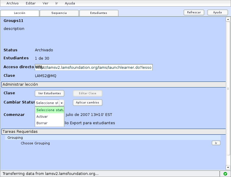 Si la deseas Archivar, la leccion no sera visible en la lista de lecciones en el curso, pero los estudiantes podran ver que esta leccion ha sido archivada si van a la pesta#a de "Mis Datos" en la pagina principal (ver imagen adjunta snapshot2.png). Nota que cuando la leccion es archivada, los estudiantes (desde Mis Datos) pueden exportar el portfolio de la leccion, pero si la leccion ha sido deshabilitada entonces no la podran ver desde mis datos. Solo los profesores la pueden ver en la lista de lecciones del curso.