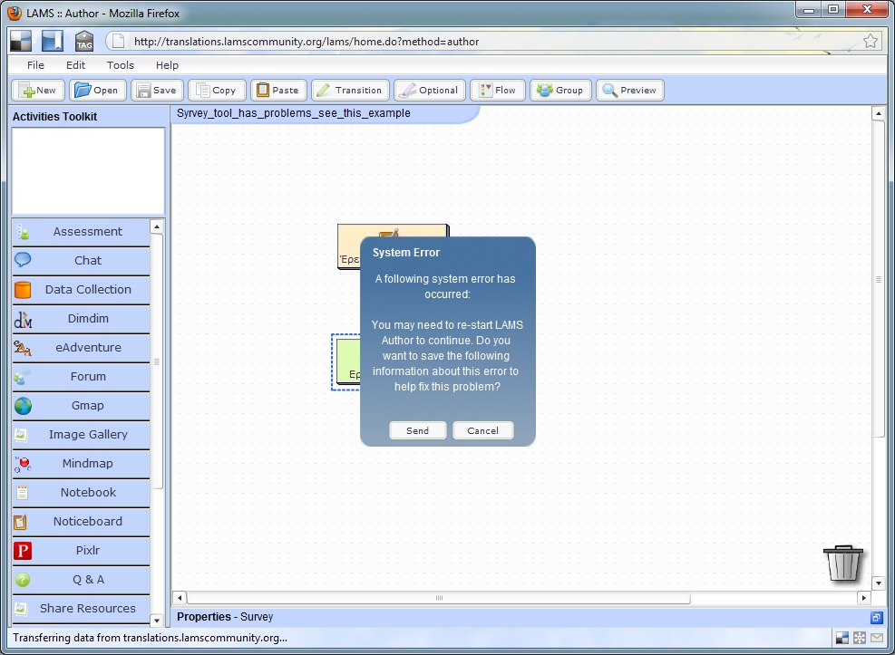 2. Author- Open the activity "Syrvey_tool_has_problems_see_this_example" from the Public Folder. 3. Just, click on the survey tool and you will see receive a System Error see the attachment. I am trying the same activity in LAMS 2.3.4 server today and the System Error does not occur! But, when i'm trying now, again on translation server i can repeat the error-message. Try by yourself. The activity is running but I'm not sure if a big number of students add data the activity hold it. Posted by Spyros Papadakis |