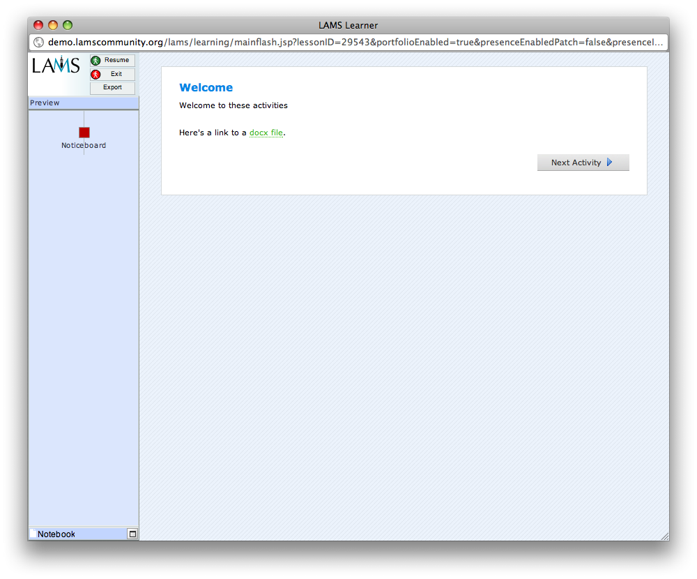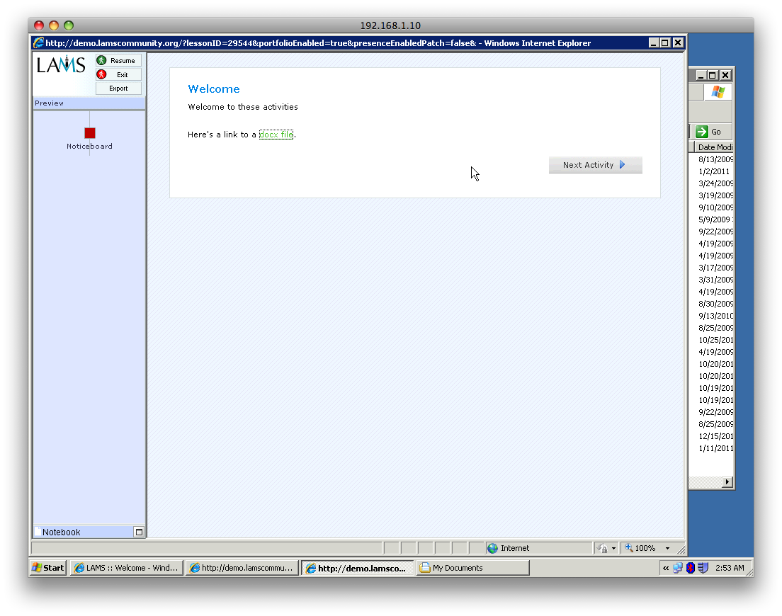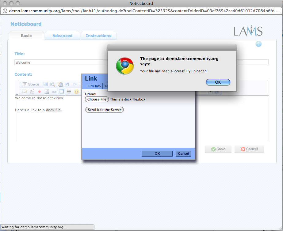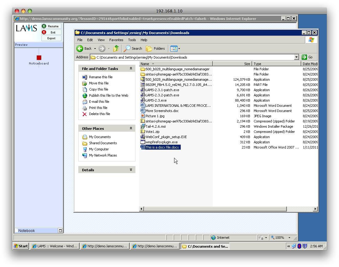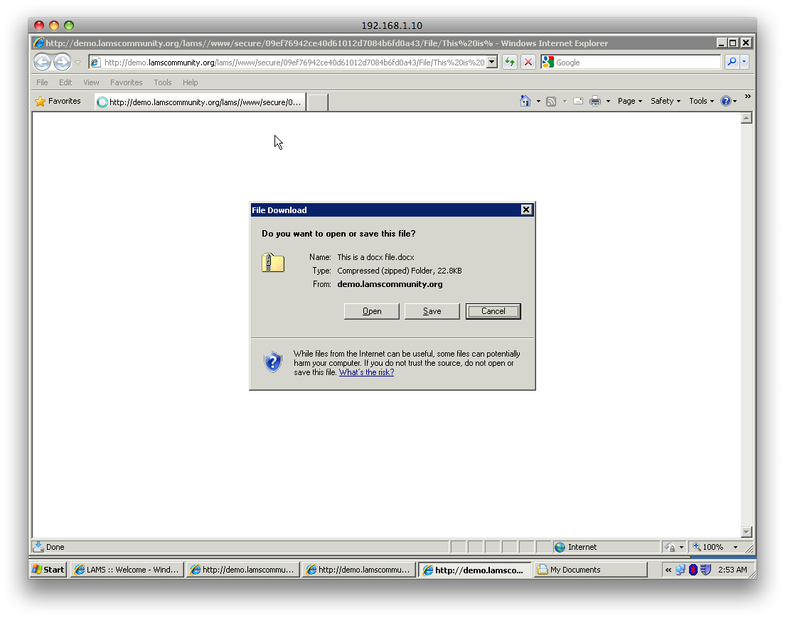 My LAMS server details: Operating system: win 2003 server I notice that in the LAMS Resource File area, .docx type files display a blank icon to the left of file name whereas .doc files (i.e. earlier office file type) display with a nice Microsoft Word icon. Not sure if this is significant. I have got our IT support to edit the FCKConfig.LinkUploadAllowedExtensions in the fckconfig.js file on the server (FCKeditor files) i.e. added docx|xlsx| etc. to the list (although we haven't restarted the server). However the files still open as a .zip. Any ideas? Could it something as simple as a server cache that needs to be cleared? Is it a server problem, a Microsoft problem (!) or a LAMS problem? Ian Davis Posted by Ian Davis |