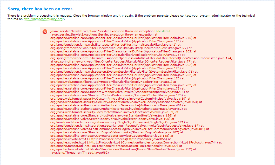 I have installed LAMS v2.3.5 on CentOS r5.5, with Moodle 1.9.11 and LAMS2 module. I have no problem create new Sequence in LAMS, but when I try to export it in LAMS format, I get a ServletException error (see attachment). If I choose the IMS format, it works fine. Any help is appreciated. Thanks! Posted by Carson T |