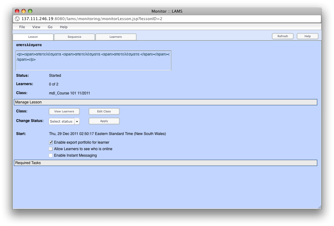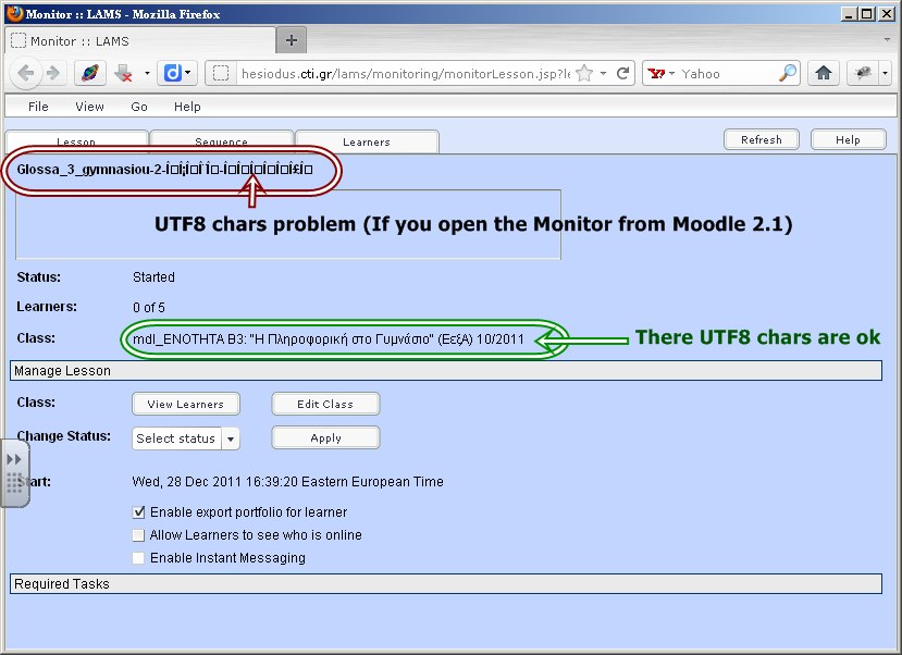 We up-grated to the latest code for lamslesson moodle module 20111205-lamslesson.zip but the UTF8 chars problem in LAMS Monitor for the sequence's name has not be solved. See the attachment. Thanks Spyros Posted by Spyros Papadakis |