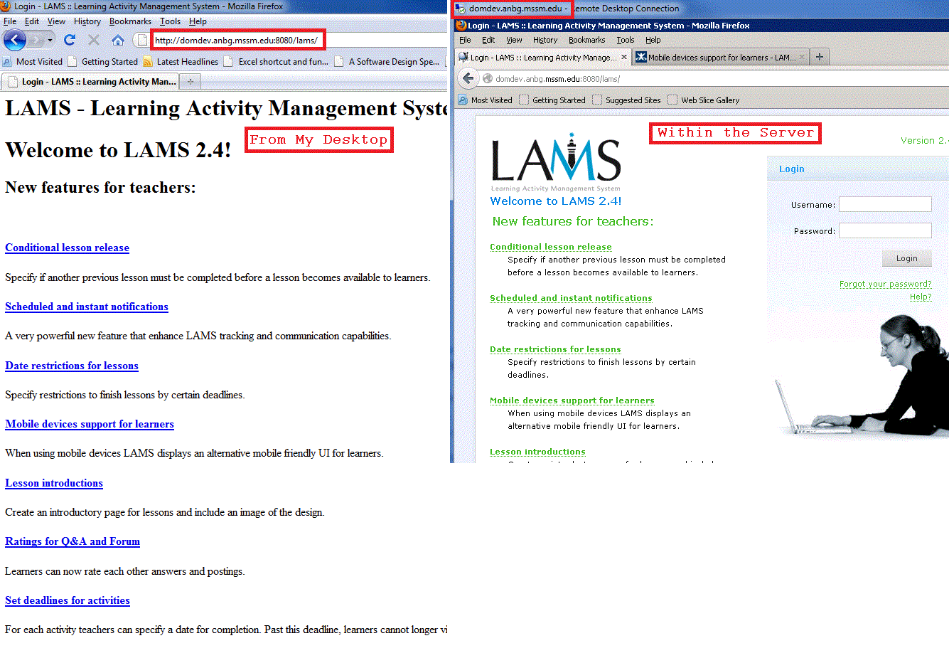 I installed an instance of LAMS. I am able to login and see all images/css/flash within the server hosting the LAMS server. When I try to view from another desktop, I am able to see the LAMS home page, but the images/CSS/Flash is missing. I am attaching an image so you can what I mean. I turned off the Firewall to make sure it was not blocking anything. The user which LAMS was install has administrative rights. LAMS Version: 2.4 Thanks, Posted by Noel Rijo |