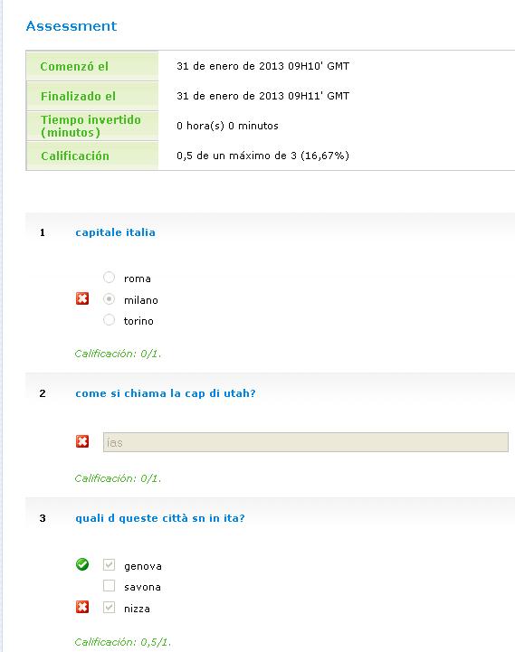 I have a question about the Assessment activity. If you select both "display correct answers" and "display wrong answers", the system displays small green and red icons just next to the answers students actually tried. Please see my attachment, first question: the right answer is, of course, Roma. A student selects Milano. The system displays the red cross and gives him 0/1 point. Posted by Luca Policastro |