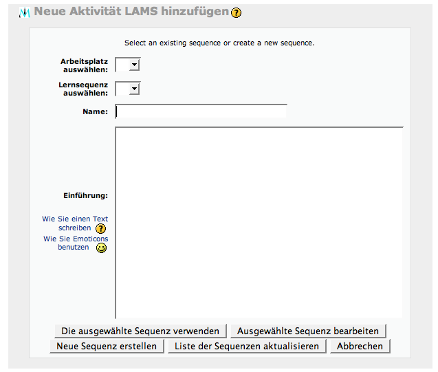 I have installed the lams-integration module in moodle according to the documentation. When I try to insert a lams activity there is no lams sequence visible to be selected. The moodle user gets created in the lams database, so the basic connection must be working. The attached image contains a screenshot of the moodle interface (german). Hopefully David Prüm Posted by David Prüm |