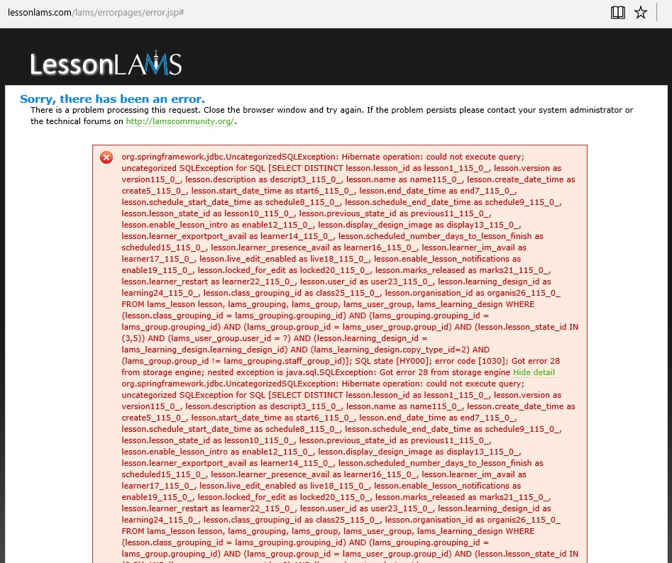 Everytime I try to log in Lessonlams, I keep finding the error: "org.springframework.jdbc.UncategorizedSQLException: Hibernate operation: could not execute query; uncategorized SQLException for SQL [SELECT DISTINCT lesson.lesson_id as lesson1_115_0_, lesson.version as version115_0_, lesson.description as descript3_115_0_, lesson.name as name115_0_, lesson.create_date_time as create5_115_0_, lesson.start_date_time as start6_115_0_, lesson.end_date_time as end7_115_0_, ..." Could you solve it? Thanks Posted by Aida Perera |