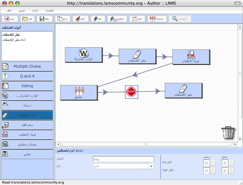We have just updated the latest translations for the week to our translations site, so you are welcome to continue the testing. This week alone we have had more than 6700+ labels translated! As I mentioned last week, Dr. Abdel-Elah Al-Ayyoub has translated almost all LAMS to Arabic. I have attached a few pictures for you to see. It looks really really nice! Thanks Dr Al-Ayyoub for your efforts. Another important announcement for this week regarding translations was the implementation of localization (i10n) in LAMS. Now all languages also have a country that will be used to present date and numbers according to the usage on those countries. So now LAMS does support both internationalization and localization! Here's the translation report for the week: Translations Reportfrom 18-Aug-2006to 25-Aug-2006 LAMS AuthoringItalian IT 163 translationsTotal LAMS Authoring: 451