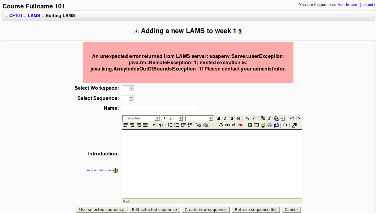 I installed LAMS 1.0.2 and Moodle 1.7 in the same server, I do all the configs needed (create an organization, insert the record in the table ext_server_org_map with my userinfo_url. In Moodle I configure the server_url, serverid and serverkey), but when I add a LAMS activity to a course I get the following error message: An unexpected error returned from LAMS server: soapenv:Server.userException: java.rmi.RemoteException: 1; nested exception is: java.lang.ArrayIndexOutOfBoundsException: 1 I install in the same server using the same LAMS, Moodle 1.6.2 and it works fine. Best regards, Alexis Aguiluz pd: sorry, but my english is not good :S Posted by Alexis Aguiluz |
