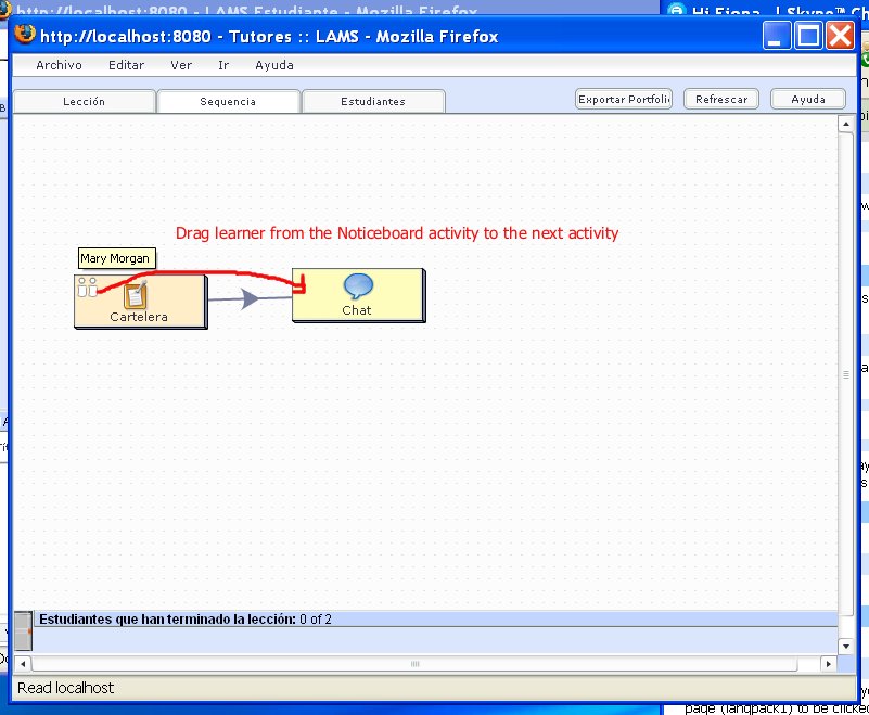 * Then you need to go into Monitor and use the force complete option - go to the Sequence tab (Sequencia in Spanish) and find the learner that you want to fix. See the attached screenshot StuckInNoticeboard.jpg. When you put the cursor over one of the little people symbols on an activity you can see their name. "Pick up" the person symbol (with your mouse) and drag it over to the next activity in the sequence. The learner's record in the database will be updated to say that they have finished the Noticeboard.