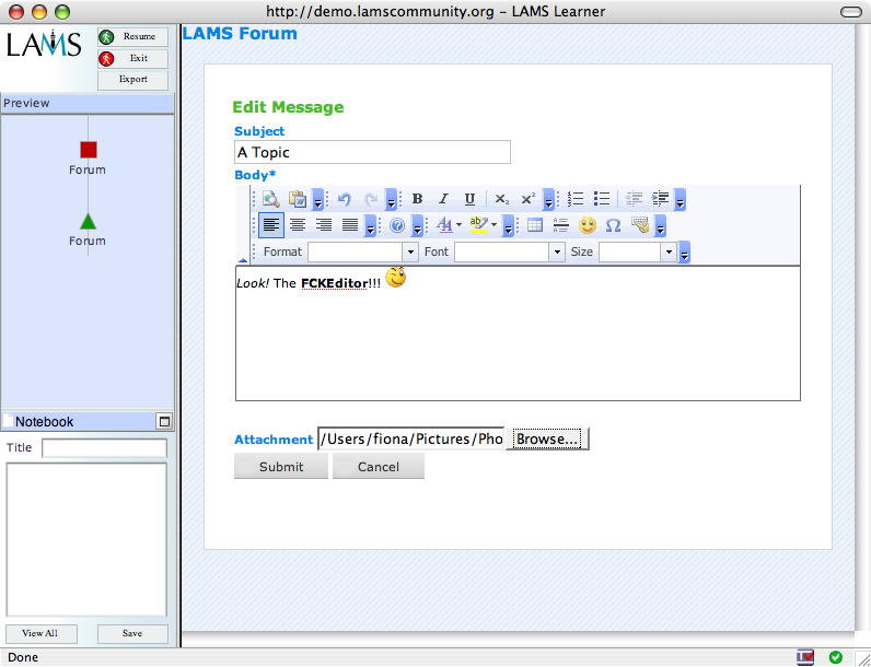 But I can help you with the FCKEditor wish. Turn on "Allow learners to use rich text editor" in the Advanced tab and the Forum should now show the FCKEditor. Some of the features of the editor are restricted e.g. users can't upload pictures within the FCKEditor like you can in authoring.