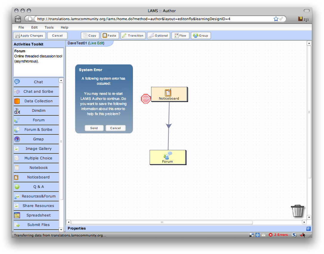 In a related note, if you get an activity into this state where you cannot save it due to missing transitions, the original editor, or any other administrator can not enter LAMS monitor. I get the message that another user is editing hte activity. This happens even if I am logged in as the particular user LAMS claims is editing.