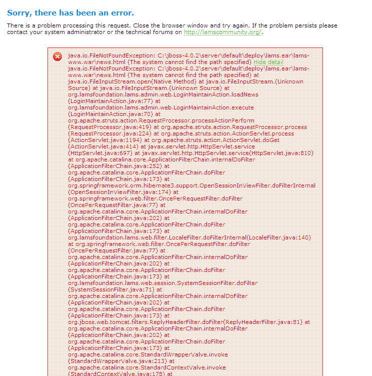 Using eclipse, I have built lams from source, getting the code from the lams2_2 branch. Once I run up the application and navigation to "System Administration"-->"Maintain login page", I get the attached error. It appears it cannot find a file located at C:\jboss-4.0.2\server\default\deploy\lams.ear\lams-www.war\news.html Interestingly, I don't have a lams-www.war directory under the lams.ear directory. Nor do I have a news.html file in code branch \lams_www\web All other pages from System Admininistraion work fine. I've made minor customizations to functionality in the Author module and I have used the tool builder I have done a rebuild, however this hasn't solved the issue. If anyone has any insights on what could be causing this, please let me know. Thanks, Posted by Praveen Pawar |
