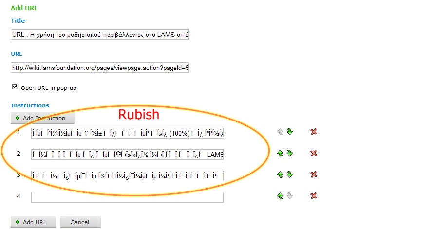 On a LAMS server running on Windows: using a Share Resource Activity when you have written instruction (e.g on Add URL)with utf8 char) and you click on Add Instruction the privious instruction displays previous utf8 instruction as rubbish.
