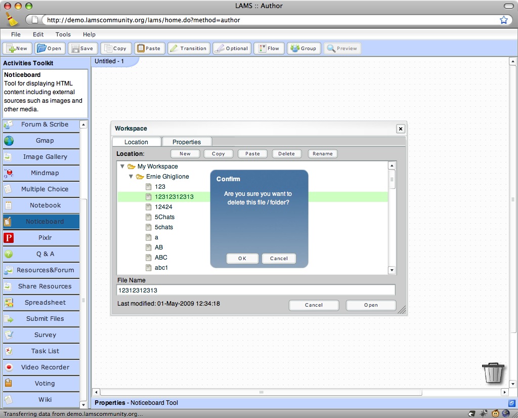 > 1. How to delete sequences. Yes, you can delete sequence from your own folder (have a look at the attach pict). > 2. How to copy an activity (with properties already configured) from one sequence to a new one. The option we have here is not as good as "copy and paste" but it will do the job though. See here: http://is.gd/5mhK8 > 3. How can I assign roles "by hand". I think you might be talking about assigning students into groups? If so, choose a grouping activity and then select the option "Choose in Monitor" and that will allow the teacher/monitor to manually assign students into groups. Also note that if what you want it so assign roles to students, then I would use a grouping activity, and then create a branching activity that uses this grouping to assign the students a set of activity according to their role/branch. Have a look at James' Role play sequence as an example: I hope that helps. Thanks, Ernie Posted by Ernie Ghiglione |