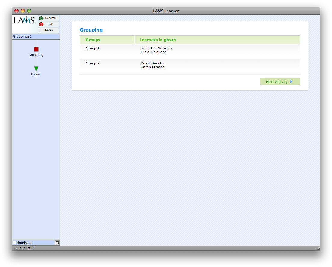 I don't have problems doing the groups with lams in the authoring part, I have the problem in the monitoring because I have all 40 students in a list but not listed in groups or something practical. I have to click the grouping tool each time I want to know which people are in which group...that is a bit impractical to mark a group work. Thanks. Posted by Sandra Ciutad |