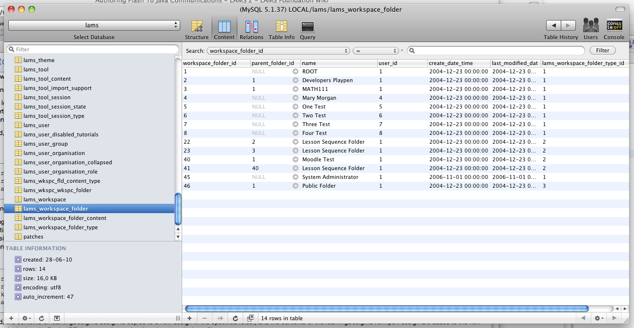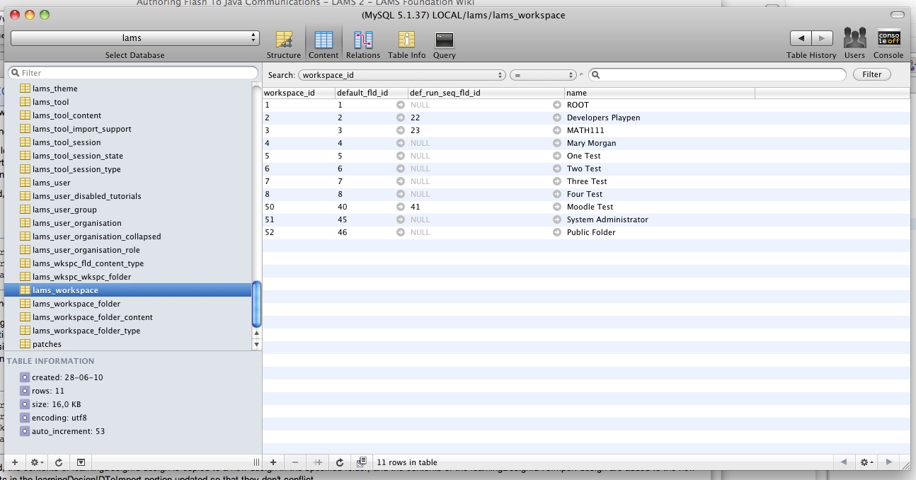 Before you do that you could check if sysadmin's workspace folder exists in the lams_workspace_folder, and that it's properly referenced in the lams_user table. Otherwise, flash usually gets the user's folderID from the UserDTO in the session I think - could be a place to start looking. Posted by Jun-Dir Liew |