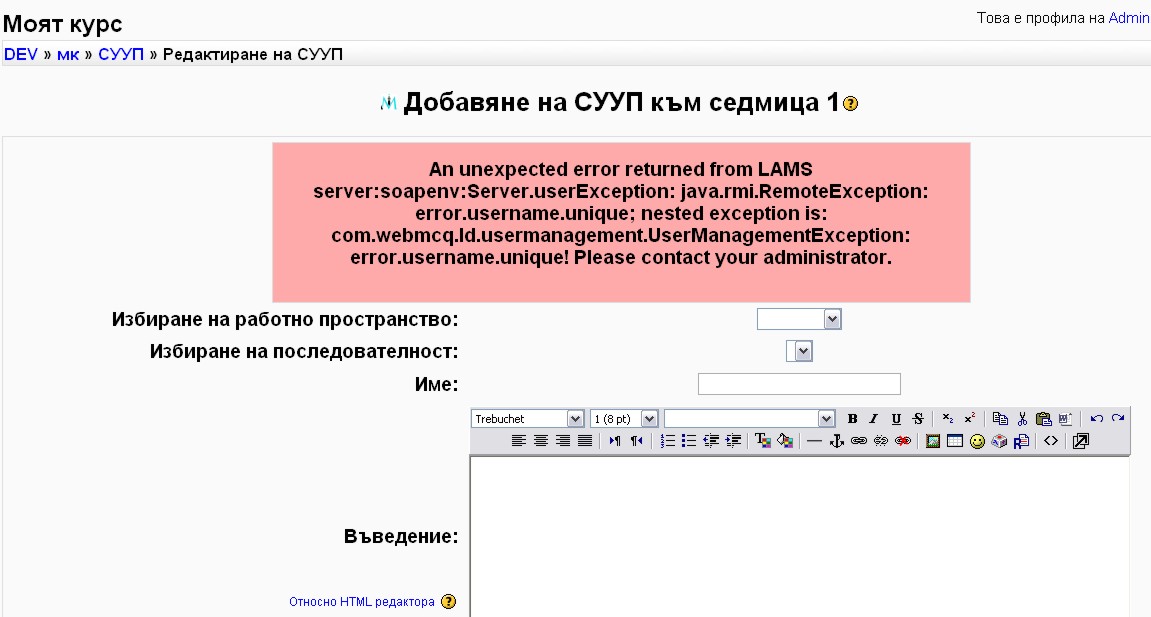 An unexpected error returned from LAMS server:soapenv:Server.userException: java.rmi.RemoteException: error.username.unique; nested exception is: com.webmcq.ld.usermanagement.UserManagementException: error.username.unique! Please contact your administrator.