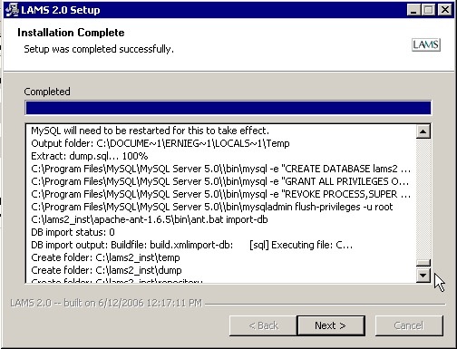 I can't find where the installer put the log in the file system. However you can see the output of the installation as it's installing by clicking the "Show Details" button while it's copying/installing files. Can you enter here what error you get when it to the part where it trying to create the database in MySQL (see the attached picture to see the MySQL steps I'm refering to). Thanks, Ernie Posted by Ernie Ghiglione |