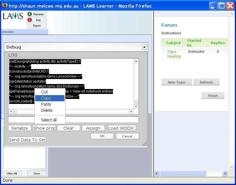 If you have access to the server's logs, it may also be worth sending those in as well (see 'Which Files to Send?' at http://wiki.lamsfoundation.org/display/lamsdocs/Creating+DEBUG+Logs)