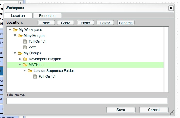 Just a quick answer - if it doesn't make sense say so and I'll try to post another answer tomorrow. We've been busy bees the last couple of days trying to get the Windows 2.0.2 installer ready. The "Public" area has been replaced by the courses. If you have the authoring role in a course then when you are in authoring and you do save, you should see the course listed in your workspace tree. Open up the course and you should be able to save your sequence in the course folder. In the attached screendump, I've expanded out the course MATH111. This screendump is taken on my PC so excuse the junk names - that is a developer's PC for you! If you want to share sequences with the whole institution (school, university, etc) then you will need to create a general course to which all of the teachers will have access. You don't need to add any learners - just use the course as a "grouping" area for public designs. You could even call the course "Public" if you wanted to! A handy tip - the folder "Lesson Sequence Folder" contains a copy of each design that is run for a lesson. When a lesson is created, we actually take a copy of the lesson and run based on the copy. This allows us to leave the original unlocked and you can continue to make changes to the sequence without affecting any running lessons. But what if you accidentally delete your only original copy? (And don't laugh - we've already had one email from someone who had a colleague do this.) If you have run it as a lesson, then you can open the copy from the Lesson Sequence Folder. It will open as Read Only. You can then save it into your own area and start editing the new copy in your local area. Fiona Posted by Fiona Malikoff |