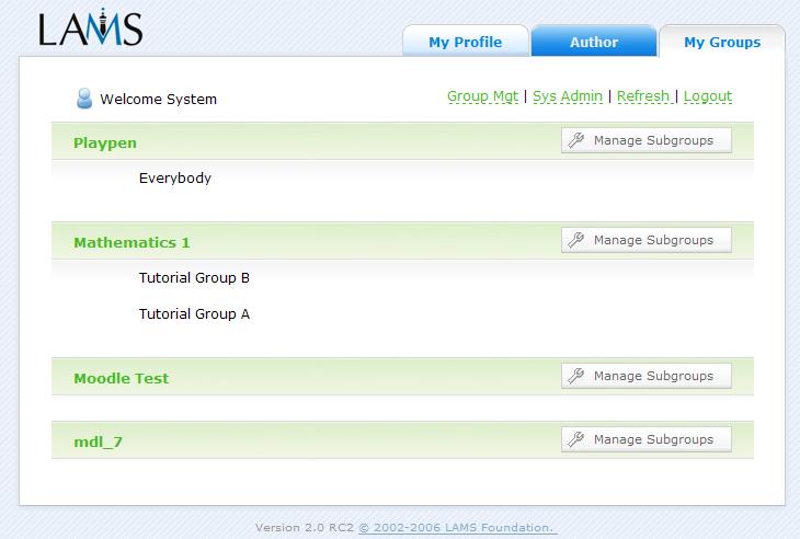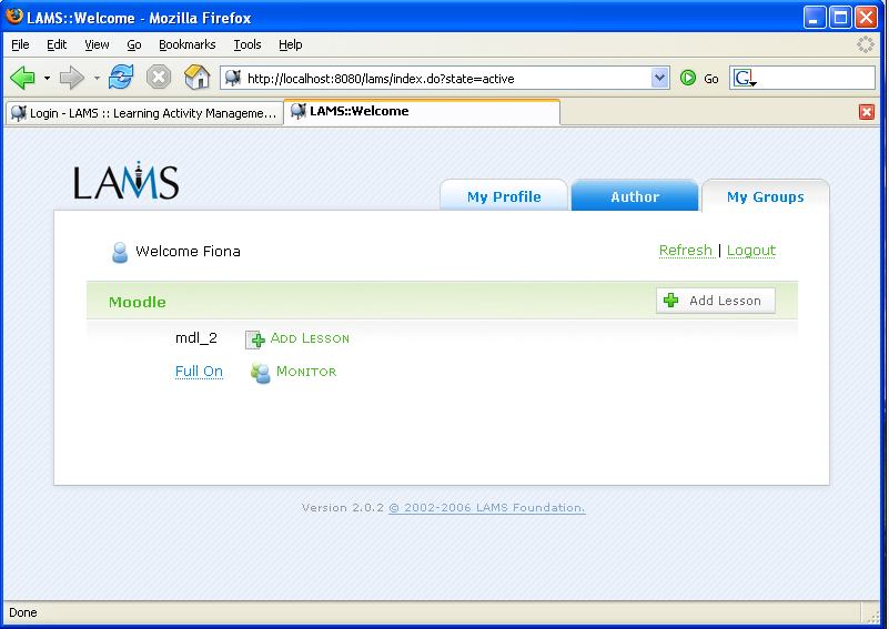 Speaking of switching to LAMS proper, once you have got into authoring in LAMS, close the authoring window but don't close your browser. Then in the same browser, can you paste the server url for LAMS into the browser e.g. http://localhost:8080/lams. This should bring up the LAMS My Groups screen. What groups do you get on the screen? You should get a Moodle group. (See MyGroups.jpg)