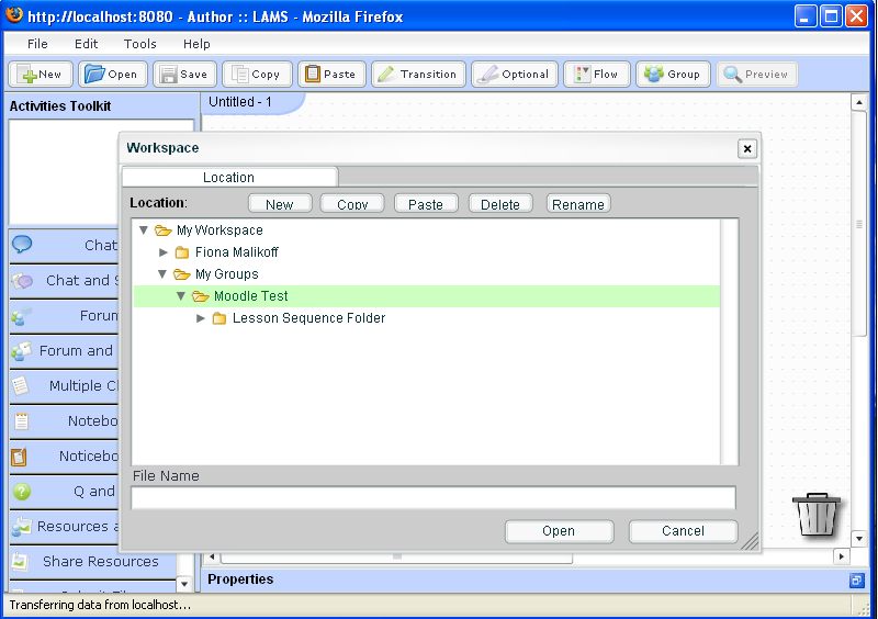 When you get into authoring in LAMS (from Moodle), and you click the Open button, do you see "Moodle Test" under the the "My Groups" section? (See WorkspaceDialog.jpg).