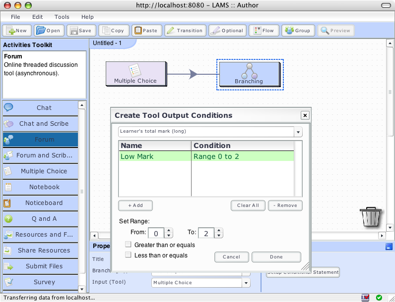 Hopefully you have had a chance to play with by now, either on the demo website or by downloading the Beta version. There are two new icons for the beginning and end points of the branches. The start icon is the green door with the arrow coming in the door and the end icon is the red door with the arrow going out the door. (See branching.png) What do you think of these icons? Green and red are the obvious colours for start and stop but red/green combination is a problem for colour blind users. We've designed it assuming that people will want to draw the branches working from left to right. So the start icon is on the left, the end icon is on the right. And the arrows go in a left to right direction. Do we have any here who uses a right to left language? If so, would you find this odd? Do you want to draw right to left? The icons can be moved (just click and drag them) so you could swap the start and end icons on the screen, but the arrows in the icon would still be going the wrong way. The wording on the screen setting up the Tool Conditions (for Tool Output Based Branching) is a bit confusing for non-programmers. (See toolcondition.png). So we will be working on that screen first. Any ideas on how we could improve the screen? Any other comments on the Branching or the Optional Sequences in authoring? Regards, Fiona Malikoff Posted by Fiona Malikoff |
