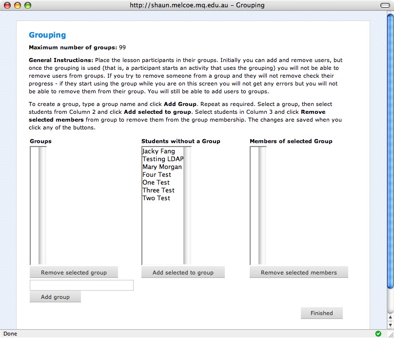 Now, you have actually discover something that I haven't thought about: when integrated with Moodle, students aren't listed in the list of available students until they click on the lesson name in the Moodle course. That's when LAMS adds the student to the lesson... and from then on, you'll be able to see this student in the list of people that you can add to a group... but unfortunately, not before.