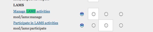 >It doesn't show up anything about LAMS on the list (user>permission>define role>admin)