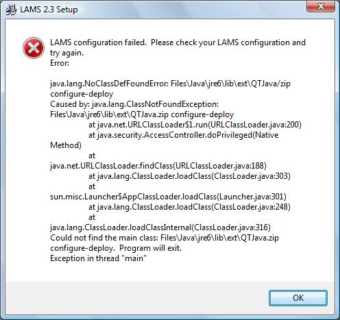 Caused by: java.lang.ClassNotFoundException: Files\Java\jre6\lib\ext\QTJava.zip configure-deploy
