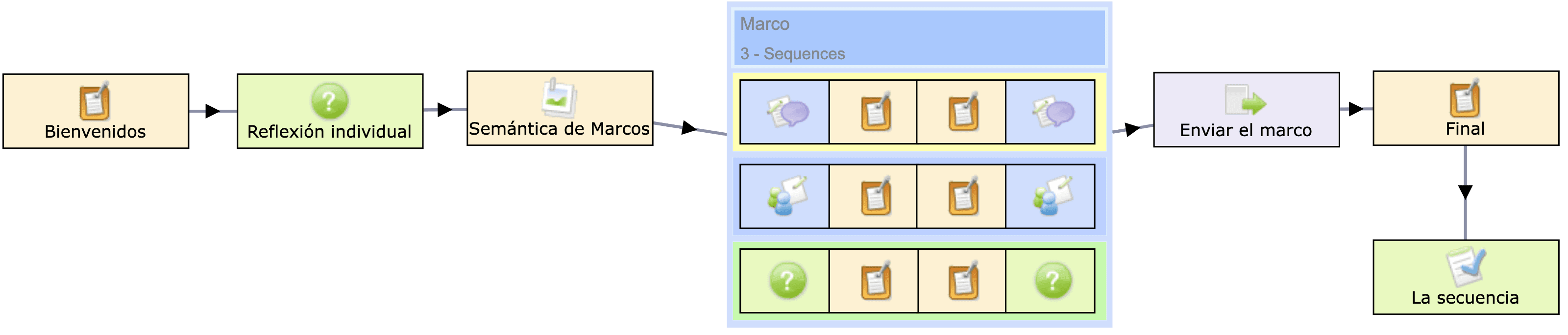Descripción: El objetivo de esta sequencia es que los alumnos aprendan a construir marcos semánticos. Para ello se les ofrece escoger entre varios estilos de aprendizaje. Esta secuencia se basa en la idea de que no todos los alumnos aprenden de la misma manera, por lo que el cuerpo de la secuencia se desarrolla entorno a un grupo de secuencias opcionales. Los alumnos tienen la posibilidad de trabajar en grupos con herramientas sincrónicas; de trabajar en grupo con herramientas asincrónicas; o, de trabajar individualmente de manera semi-colaborativa.